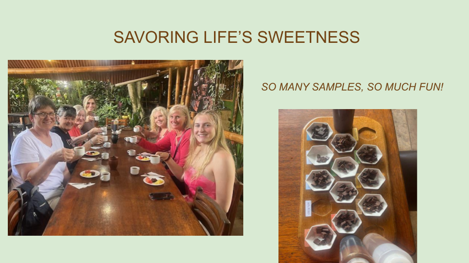 Your day might include a walk along forest trails, time by a waterfall, journaling in a quiet corner, or a visit to a nearby coffee farm or chocolate factory. Perhaps today you will glide over the canopy on a zip line, enjoy tropical bird watching, or visit a hummingbird sanctuary where color and movement feel almost unreal.